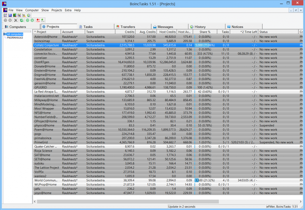 This shows that only 5 projects are even enable to work on this machine atm. Three are nci's, with WCG running cpu tasks and Collatz should be my only gpu project right now. Further it shows that Collatz is (should be) high up on the food chain for work.